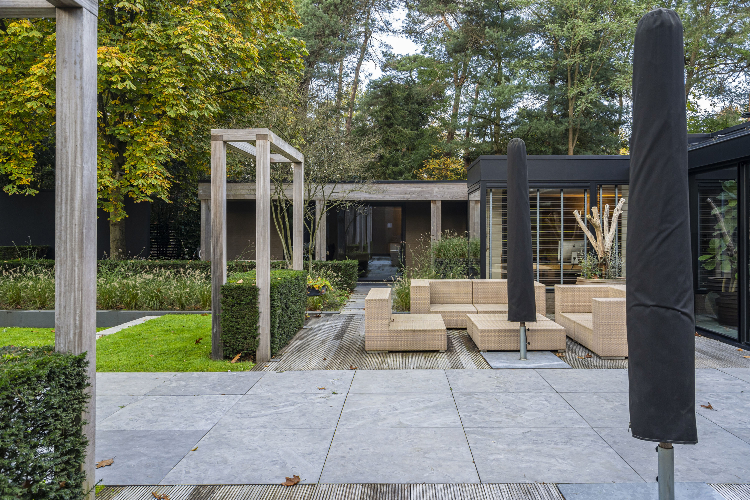 En dan… de tuin! Onder architectuur van PUUR Groenprojecten is de tuin smaakvol verdeeld in verschillende vlakken met natuurstenen trappen en houten terrassen, voor een boeiend lijnenspel vanaf het zonneterras. Ook de privacy is uitermate goed; je hebt vanuit de tuin een prachtig uitzicht op het bos en kunt toch optimaal genieten van de zon. Een roestvrijstalen designpaal met schommel-ei voegt een speels accent toe. Achter in de tuin is nog een discreet opgestelde houten schuur met grote deuren, handig voor tuinmeubelen en gereedschap. Aan de achterzijde van de schuur is een overdekte ruimte waar het hout voor de open haarden droog kan wachten op de winter.