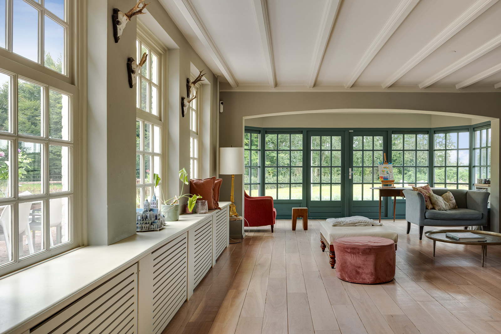 Een multifunctionele tussenkamer verbindt de woonkamer met de woonkeuken. Hier ziet u een houten vloer, balkenplafond en fraai behang op de wanden. Deze ruimte, met openslaande deuren richting een op het zuiden gelegen terras, is onder andere geschikt als speelkamer, als werkruimte, leeshoek of hobbyruimte.