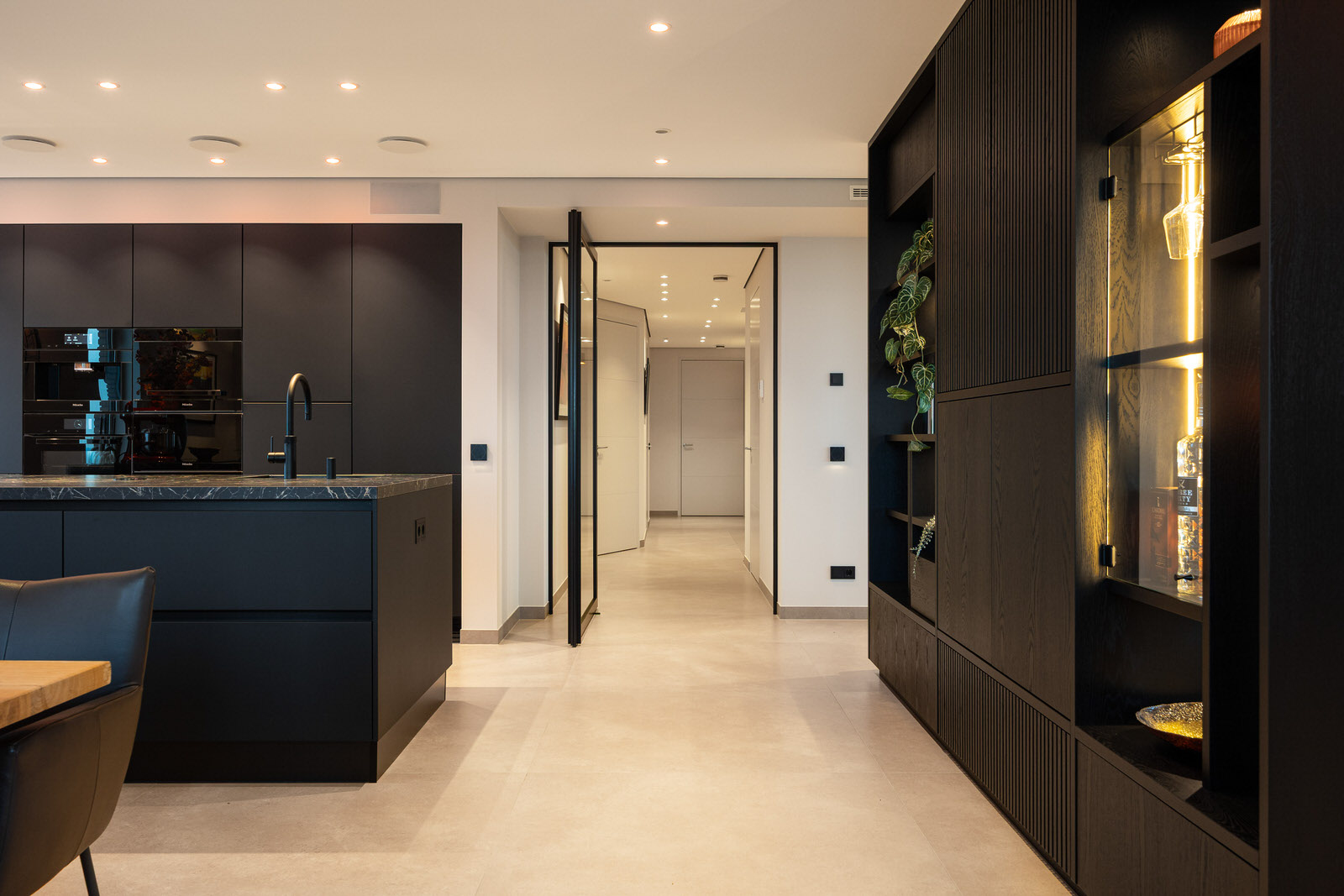 Bij binnenkomst ervaart u direct het gevoel van ruimte en luxe: de hal vormt een elegante ontvangst en geeft toegang tot bijna alle leefruimtes en praktische voorzieningen, zoals de garderobe, het gastentoilet, de wasruimte, technische ruimte en inpandige berging. In het hele appartement is een doordachte, hoogwaardige afwerking toegepast, waaronder strakke stucwerk wanden, een naadloos akoestisch plafond met inbouwspots en speakers, en een neutrale tegelvloer met vloerverwarming, die een rustige en stijlvolle basis vormen voor de rest van het interieur.