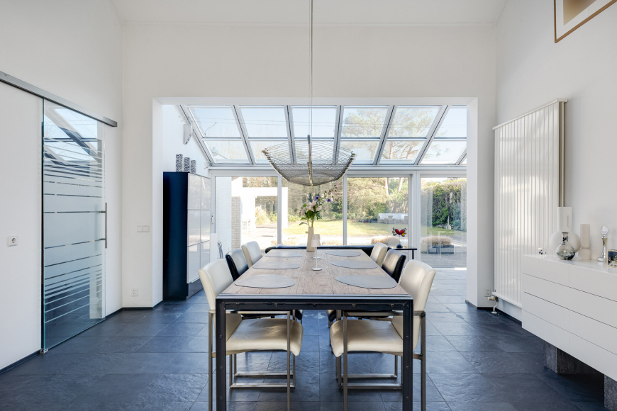 Het eetgedeelte vormt het middelpunt van de begane grond. Vanuit hier staan alle lijnen open: naar de woonkamer, naar de keuken en naar de serre. De serre strekt zich uit over de volledige breedte van de woning en voelt als een tussenruimte — beschut, licht en met een directe verbinding naar het terras en de tuin. Het glazen dak en de brede schuifpui maken deze plek het hele jaar door aantrekkelijk.