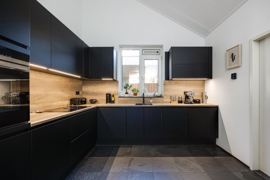 De keuken, vernieuwd in 2022, is modern en ingetogen. Het L-vormige ontwerp combineert veel werk- en bergruimte met hoogwaardige apparatuur, waaronder een Bora kookplaat, Quooker Cube en stoomoven. Dankzij de hoge nok en het raam boven het werkblad is de ruimte licht en prettig in gebruik.